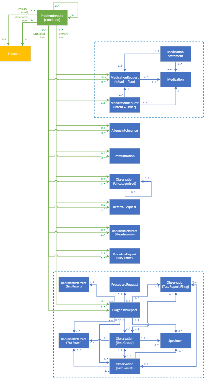 DiagnosticReportprofile - if any item related to a diagnostic report is flagged as a problem the diagnosticReport MUST be linked to the problem as a related clinical item. - for a Diary Entry - reference the