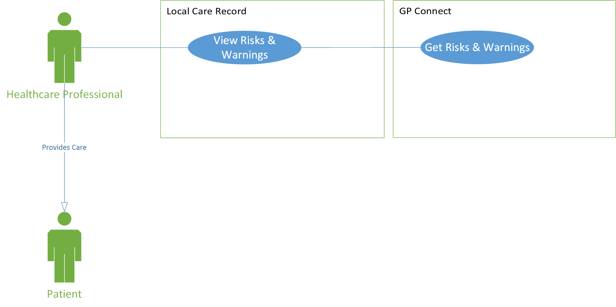 A patient is admitted to hospital. The clinician responsible for the care of that patient in the hospital needs to review their care history and their recorded current and past risks and warnings from the GP practice clinical system to assist in determining the appropriate care provision and support. They have access to the LCR, which shares clinical information relevant to the direct care of their patient from a variety of local hospital, community and GP organisations.
